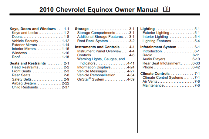 The complete 2010 Chevrolet Equinox owner’s manual with images, illustrations and guides for driving, using and maintaining the vehicle.