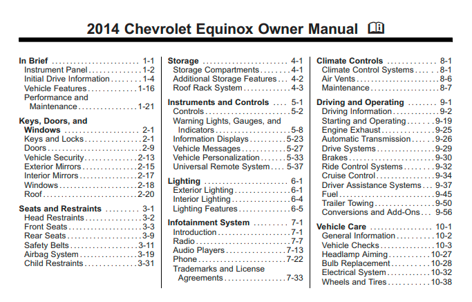 The complete 2014 Chevrolet Equinox owner’s manual with images, illustrations and guides for driving, using and maintaining the vehicle.